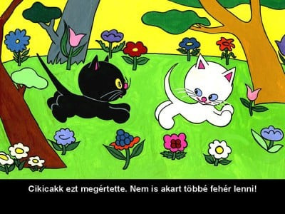 Élt egyszer egy kedves kiscica: Cikicakk. Fehér volt az anyukája, fehér volt az apukája. Fehér volt a testvérkéje, Cilike is. Csak ő volt fekete. – Én sem leszek többé fekete, mert a fehér cica szebb! Kitalálok valamit!