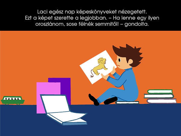 Szégyen vagy sem, bizony sok kisfiú küszködik a félelemmel. Lacinak sikerül leküzdenie szorongásait, amiben nagy szerepet játszik új barátja, az oroszlán. És ha már Laci elég bátor, az oroszlán továbbsiet, hogy más kisgyermeknek is segítségére legyen!