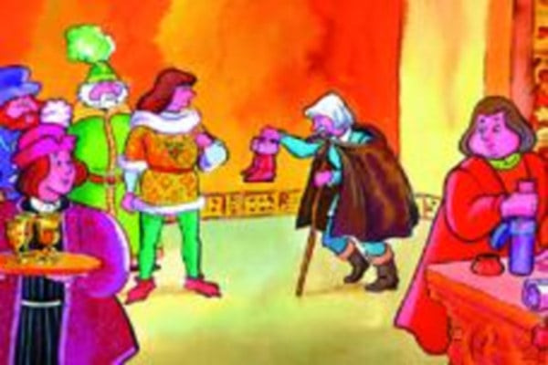 A varga piros csizmát készített a királynak, ám a palota kapujában strázsáló két őr azonban csak úgy engedik be, ha majdani jutalma egyik felét egyiküknek, másik felét a másikuknak adja. Az eszes varga azonban mégis kincsekkel tér haza.